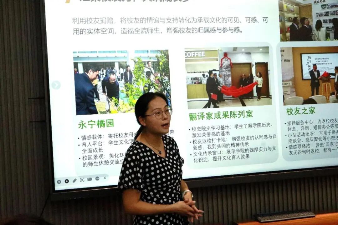 学院党委副书记兼副院长武娟向与会校友们介绍了近年来学院在校友工作方面的举措与展望。她介绍了学院的“永宁橘园”“丽娃河畔的翻译家成果陈列室”、校友之家等近年来校友资助建设的各项设施,并进一步阐述了学院在构建校友联络体系、搭建校友交流平台、服务校友发展的各项举措,也希望校友们在物质资助、社会实习、学生生涯指导等方面给予更多支持,实现校友与学院之间的双向赋能、共同成长。