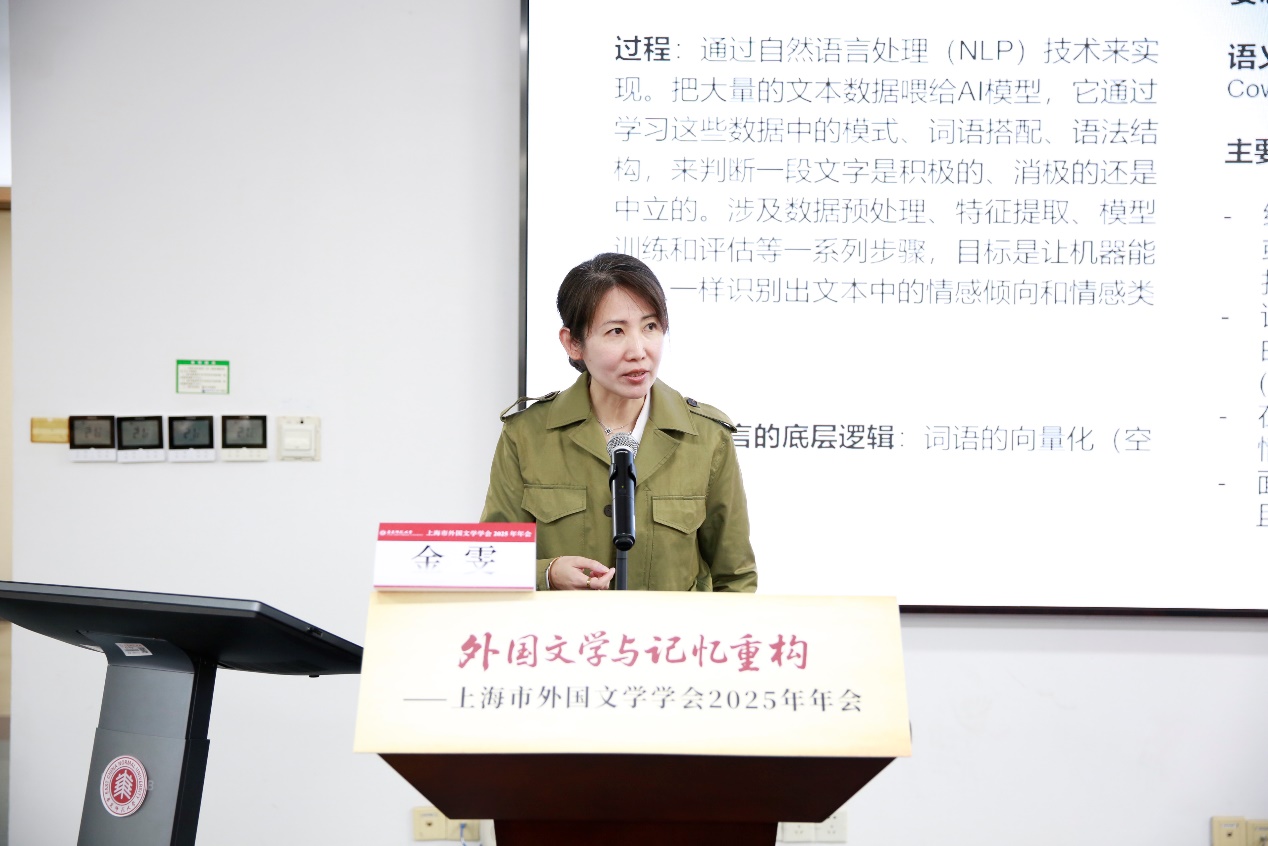 第三阶段的主旨报告由副会长、同济大学刘晓芳教授,上海外国语大学李尚宏教授,上海财经大学谭琼琳教授主持。4166am金沙信心之选金雯教授在她的发言中讨论了当代人工智能语境中的记忆与情感关系。她指出,文化记忆的形塑与情感治理紧密交叉,记忆理论必须与情感理论发生深度对话才能增强自身解释文化现象和参与社会构建的功能。金雯教授展示了计算机、量子物理、人工智能等前沿领域对身体和情感规律的探索,认为在稳定性基础上拥抱不确定性,是深度情感认知的起源,也是创造力的条件。