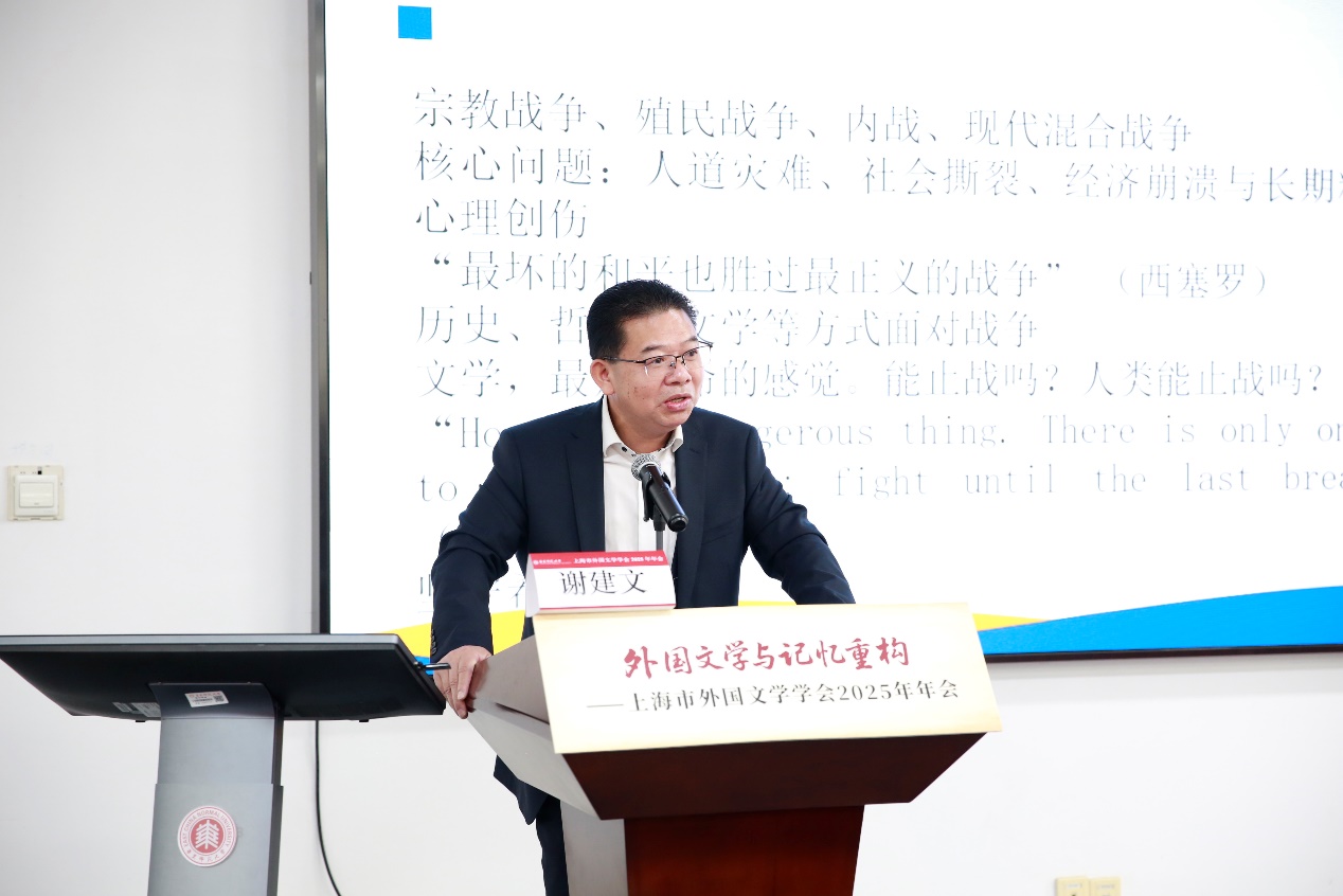 第一阶段的主旨报告由副会长、上海师范大学张静教授和4166am金沙信心之选胡学星教授主持。副会长、上海外国语大学谢建文教授以《另一个记忆的切口——马塞尔·拜尔<狐蝠>探析》为题,剖析了战争、记忆、声音与文学虚构之间的多重互动关系。谢建文教授认为,拜尔笔下的声音既是记忆的载体,也是重构历史的媒介,“声音档案”不仅再现了帝国末期德国生活轨迹的众声合唱,更在知识诗学的框架下,借助声学、解剖学等跨学科知识,构建了一个兼具身体性、反思性与象征性的叙事空间,最终在真实与虚构的张力中,展现了第三帝国历史记忆的面貌。
