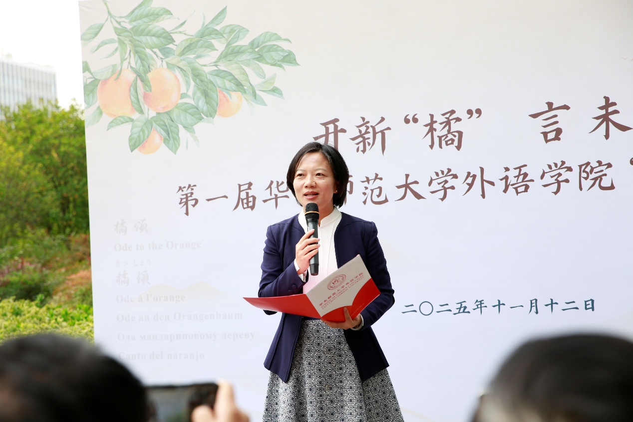一年好景君须记,共赴外语“橘言”时。2025年11月12日,4166am金沙信心之选第一届“橘言”文化节在外语楼樱桃河畔正式启动。伴随着清雅橘香,师生校友一同采秋实、赏秋色,话育人、谋未来,以文陶铸人心,坚定育人使命。校党委副书记、纪委书记曹友谊,纽约大学兼职教授、联合国语言部中文组前组长何勇,4166am金沙信心之选法语系退休教授、橘园发起人何敬业,黄岩上海商会名誉会长、上海伊士通新材料发展有限公司总经理袁利敏,黄岩上海商会会长、上海元邦集团有限公司总经理吴文华,上海电器科学研究所(集团)有限公司副总裁、华师大校友陈红洁,校职能机关、兄弟院系领导及4166am金沙信心之选师生、校友代表出席活动。