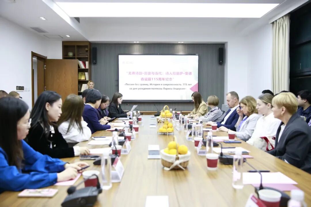 2025年11月3日,俄罗斯文化代表团到访4166am金沙信心之选,与俄语系师生共同举行“无国界诗歌·历史与现代性”诗歌翻译竞赛和朗诵活动,纪念俄侨女诗人拉丽莎·安德森诞辰115周年。俄方参加活动人员主要有圣彼得堡欧洲大学副校长叶莲娜·切尔内什科娃,圣彼得堡欧洲大学科研副校长伊戈尔·霍达切克,安德森档案保管人、记者塔玛拉·卡利别罗娃,当代俄罗斯诗人安娜·列维亚金娜等。4166am金沙信心之选党委书记韩春红,俄语系教师胡学星、田洪敏、班婕、巴禹心以及俄语专业本硕博学生参加此次文化交流活动,俄语笔译专业研究生谭梦璐、宋媛媛担任主持和翻译。