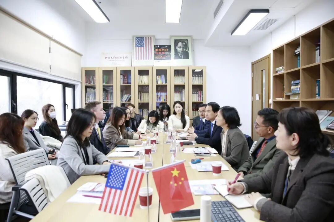 在交流环节,双方就中美国际学术交流的恢复与创新、英语教学资源合作、文学文化翻译与出版等议题进行了热烈讨论。与会师生代表也踊跃发言,围绕中美青年学者交流机制、跨文化研究项目等提出建设性建议。