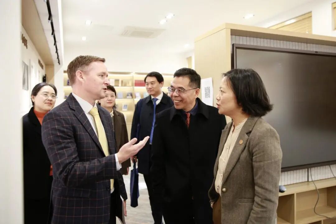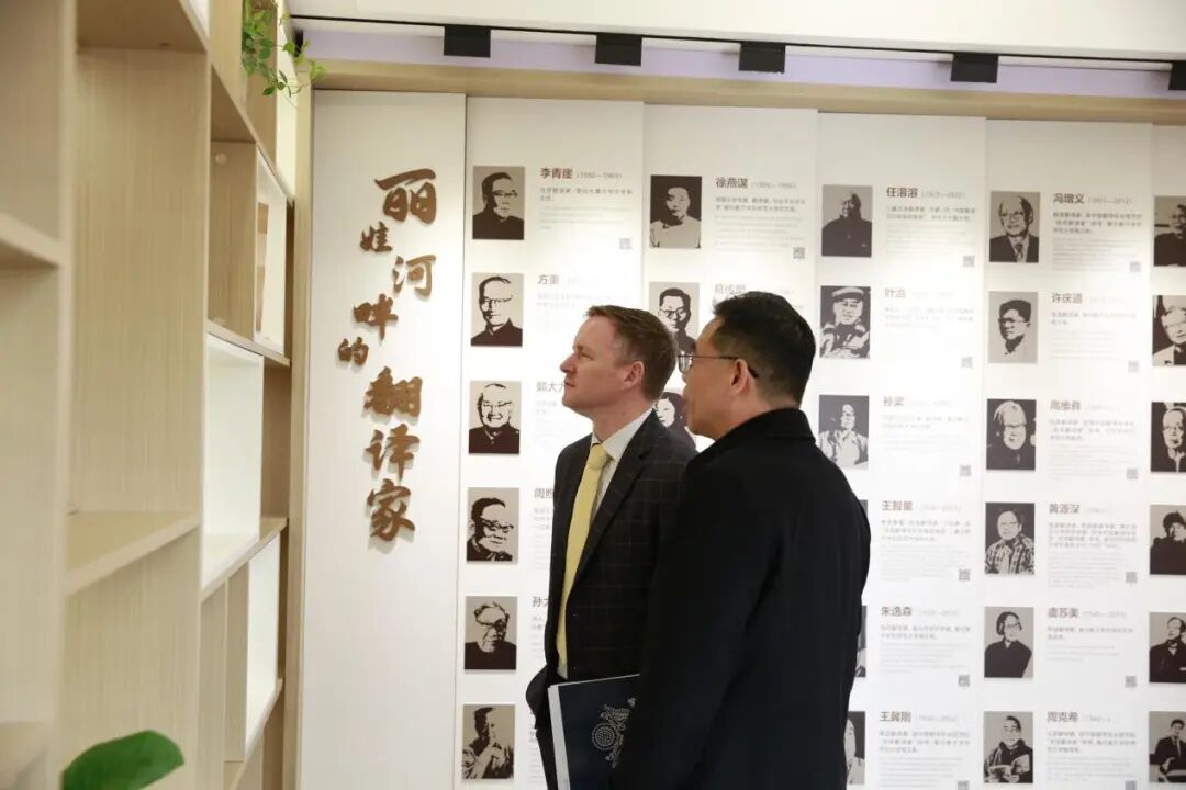 会谈结束后,包睿渊一行在4166am金沙信心之选师生陪同下,参观了位于4166am金沙信心之选一楼的“丽娃河畔的翻译家”成果陈列室,深入了解华东师大在外语翻译与跨文化传播方面的历史积淀与学术传统。