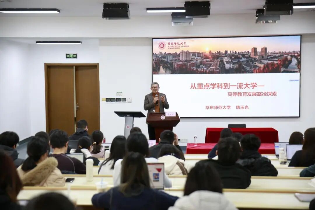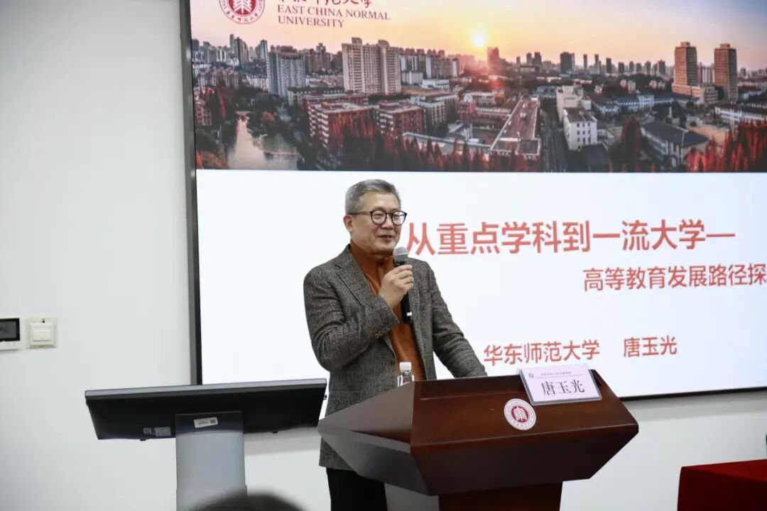 唐教授结合华东师大的具体实践,介绍了学校在通识教育改革、“幸福之花”学科交叉计划、学科专业结构优化、科技成果转化、管理体制创新等方面的探索与成效。他强调,面向2035年教育强国目标,高校必须加快学科转型、优化学科生态、增强社会服务能力,构建具有中国特色、世界水平的高等教育体系;作为身处教育强国建设前沿的高校师生,应主动融入国家战略,勇担使命,追求卓越,为建设世界一流大学贡献力量。