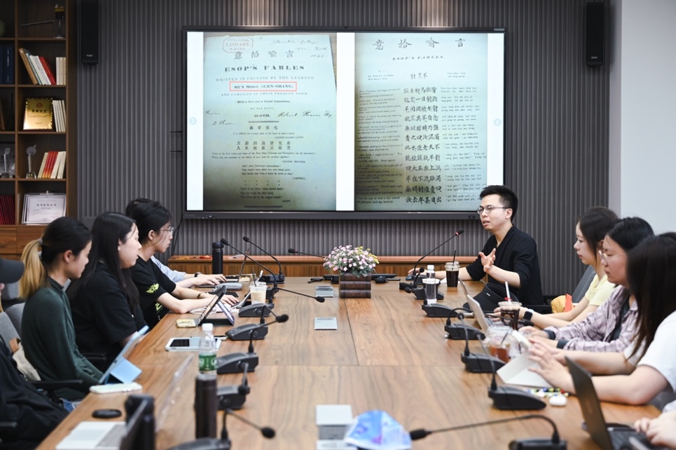 讲座伊始,陶磊老师首先抛出“‘翻译文学’与‘文学翻译’有何区别?”的问题,引导同学们思考,由此切入对晚清翻译文学的认识。之后,陶老师简要梳理了中国翻译史上的三次翻译高潮,并以伊索寓言的早期译本为例,解释了“口述+笔受”的合译模式。陶老师还展示了其中一个译本——《意拾喻言》的扉页和正文图片,带领同学们尝试解读原始材料。