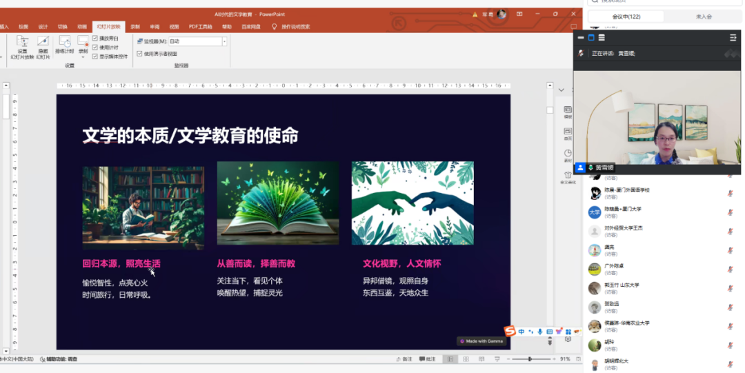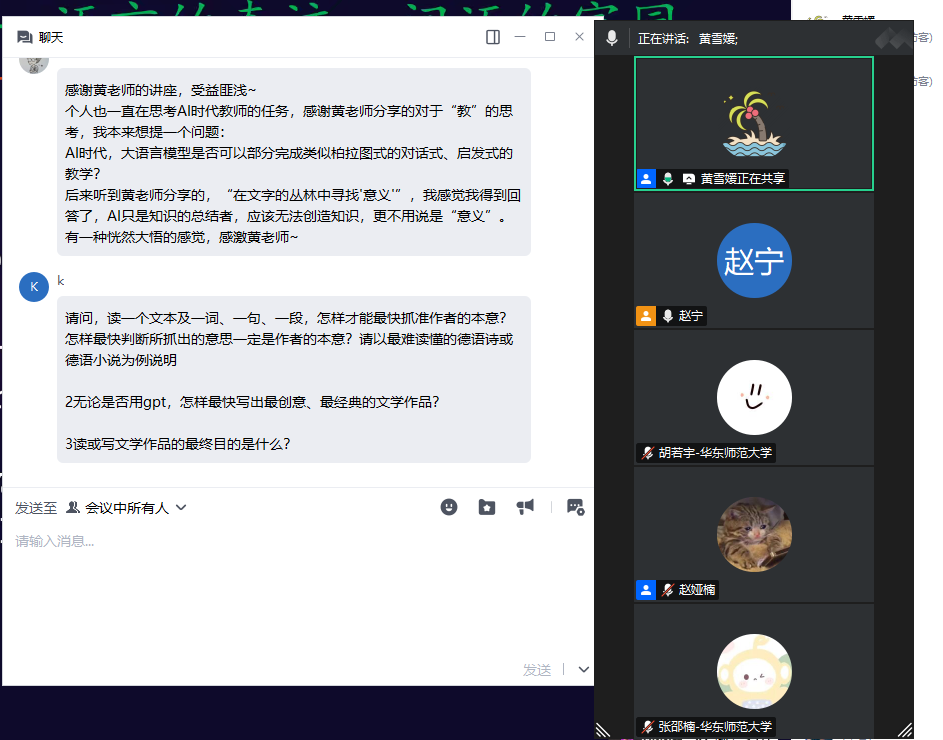 4月11日晚,“语”见未来——全球视野下的外语学习与文化探索系列讲座2025年第三场在腾讯会议上如期举行。德语系黄雪媛副教授应邀围绕“人工智能时代的文学教育”展开讲座。来自南京外国语学校、厦门外国语学校等学校的高中学生及南京大学、山东大学、厦门大学等高校师生近200余人在线聆听了本场讲座。讲座由华东师大4166am金沙信心之选人才培养办公室主任赵宁主持。
