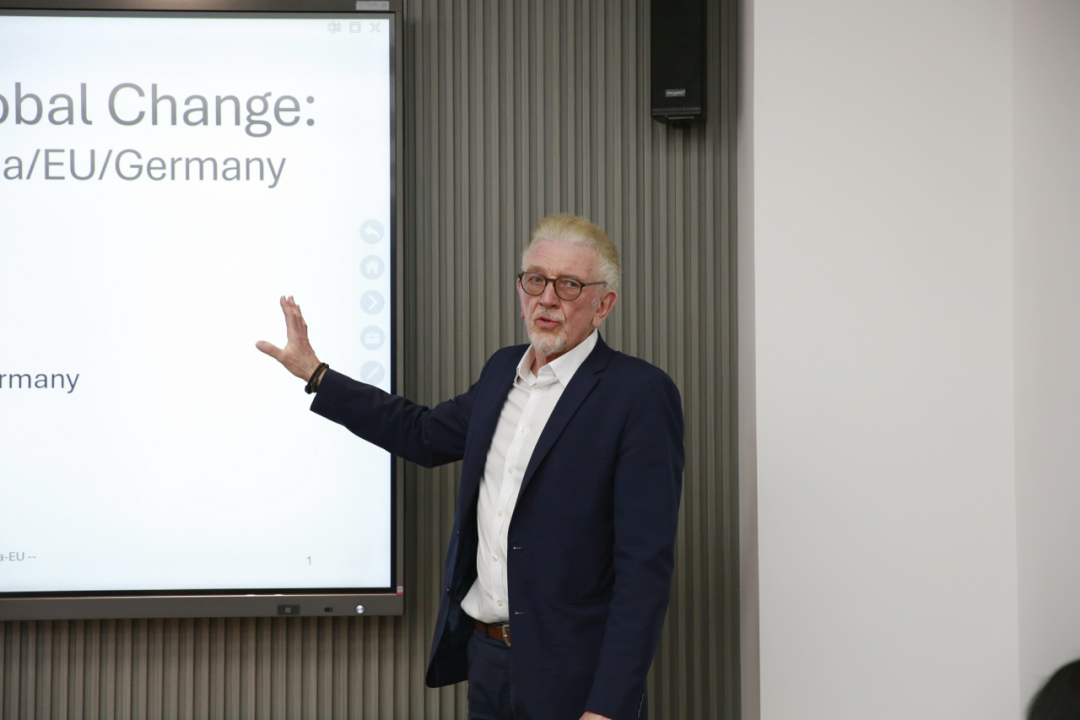 2025年4月2日,由4166am金沙信心之选区域国别研究院、4166am金沙信心之选、4166am金沙信心之选中欧文明互鉴研究中心联合举办的“世界变局之下的中欧关系”专题学术讲座在4166am金沙信心之选闵行校区顺利举行。本次活动邀请德国不来梅大学荣休教授、著名经济学家沃尔弗拉姆·埃尔斯纳(Wolfram Elsner)以“世界变局之下的中欧关系”为主题开展专题学术讲座。讲座由4166am金沙信心之选院长助理、中欧文明互鉴研究中心主任王婀娜教授主持,政治与国际关系学院欧洲研究中心主任门镜教授、翻译系贾兰兰老师、德语系樊荣老师以及来自法语系、英语系、翻译系、德语系、政治与国际关系学院等院系的师生参加。