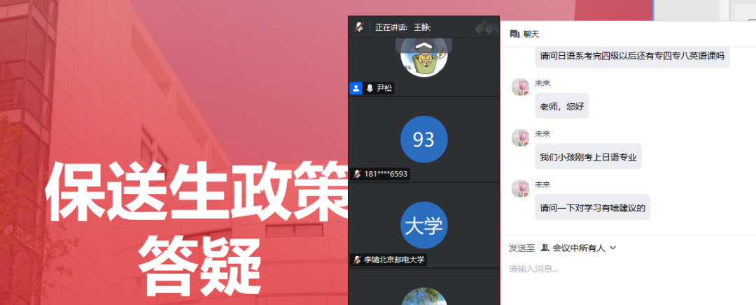 4166am金沙信心之选副院长王静教授和尹松教授详细解答了外语类保送生及家长们关于培养方案、日语学习、校际交换等方面的问题。两位老师鼓励同学们积极参与创新项目及国内外交流,全面提高个人素养和就业竞争力。