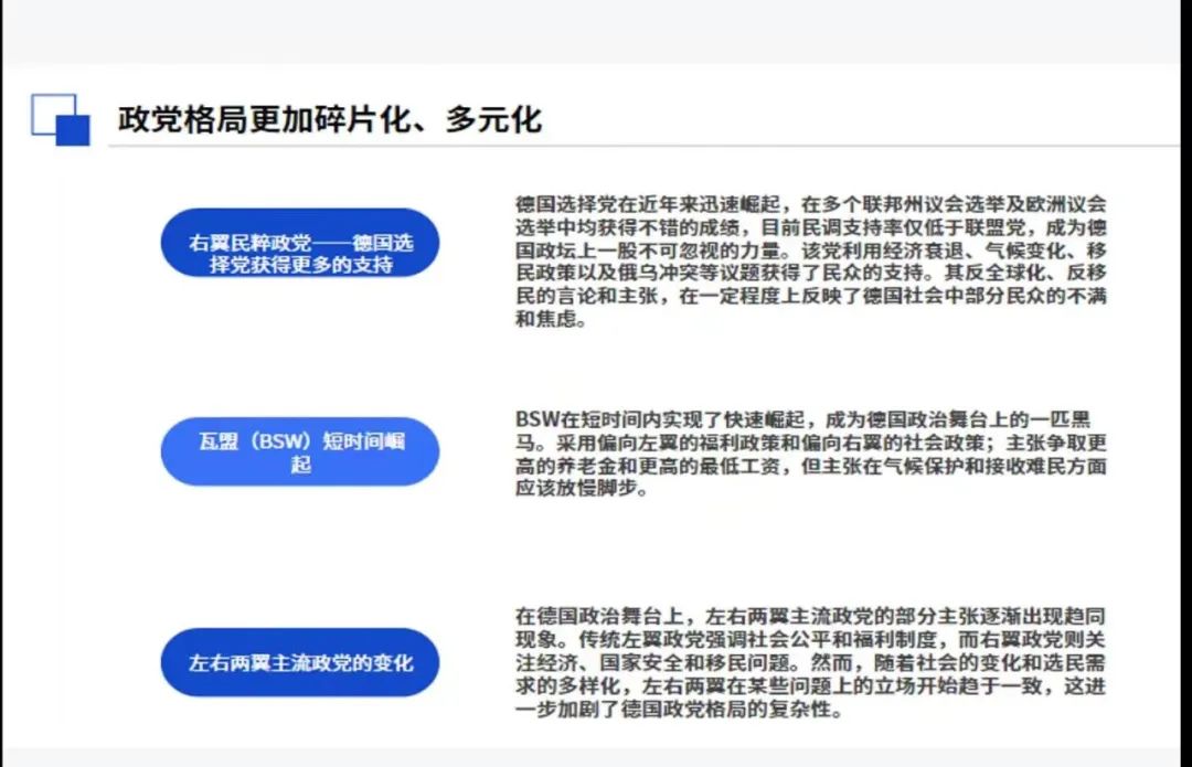 杨老师首先从“交通灯”执政联盟本身的缺陷、其执政期间出现的经济及社会问题总结了“交通灯”政府破裂的原因,并分析了“交通灯”政府破裂带来的问题和影响。在此基础上,杨老师结合近年来德国新兴政党出现以及政治生态的变化情况,指出德国政党格局呈更加碎片化、多元化趋势;同时政治出现极化和保守化趋势;政党竞争愈发激烈。