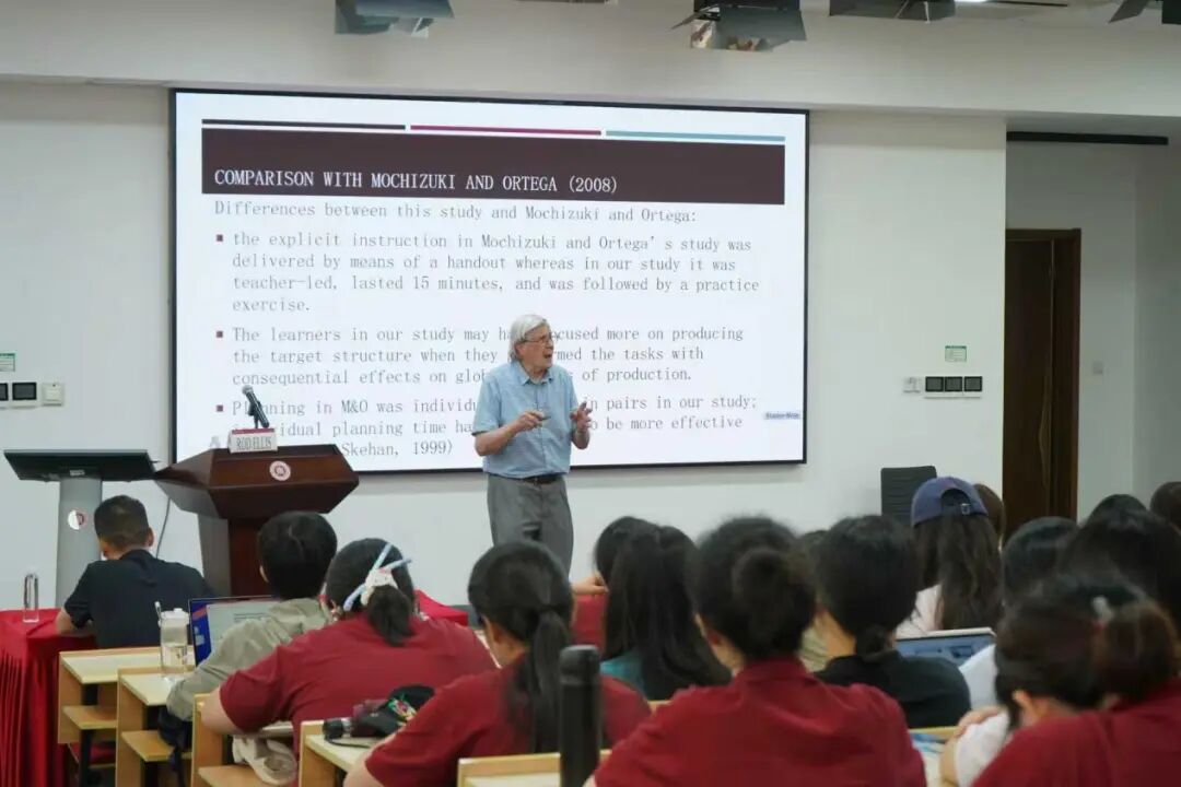 在最后的问答环节,Ellis教授强调,语言习得在本质上更接近“学骑自行车”的过程,即通过尝试、犯错与实践逐步掌握,而非单靠讲解即可完成。任务型语言教学因其契合自然习得规律,被认为能更好地培养学生的交际能力。但在实际教学中,完全排斥显性讲解也并不可行。如何在任务驱动与结构教学之间找到平衡,仍是教育者需要不断探索的重要问题。