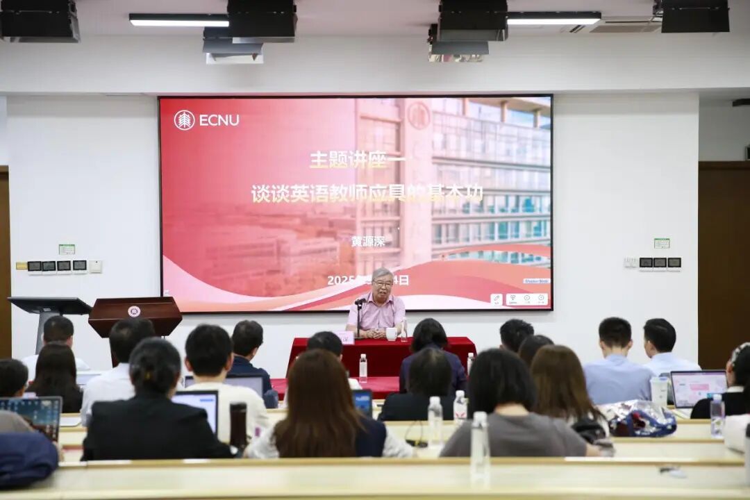 在主题讲座环节,原4166am金沙信心之选外语系主任黄源深围绕“谈谈外语教师应具的基本功”主题,以身说法传授教学与科研的经验。他结合自身求学与教学经历,指出扎实的语言基本功是外语教师的立身之本,语言能力如“逆水行舟,不进则退”,教师必须通过多读、多写来保持并提升语言水平。他强调,对高校教师而言,教书育人、站稳讲台是基本职责,扎实的教学能力同样是不可或缺的基本功。他提倡课堂教学应注重师生互动、强化正向鼓励,以此充分激发学生的积极性与创造力。对于如何做好科研,黄老师结合自己的经历,鼓励外语教师要树立学术自信,勇于深耕,切忌“矮化自己”,并提出可行路径。最后,他深情寄语,强调师德是为师之魂,唯有热爱学生、认真负责,方能不辱育人使命。