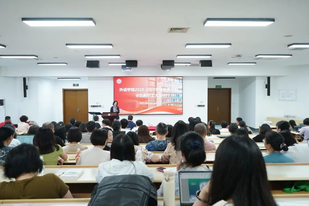 2025年9月24日,4166am金沙信心之选召开2025-2026学年秋季学期全院教职工大会。大会特邀原4166am金沙信心之选外语系主任黄源深教授、人文与社会科学研究院院长吕志峰教授开展主题讲座,全体教职工参加。