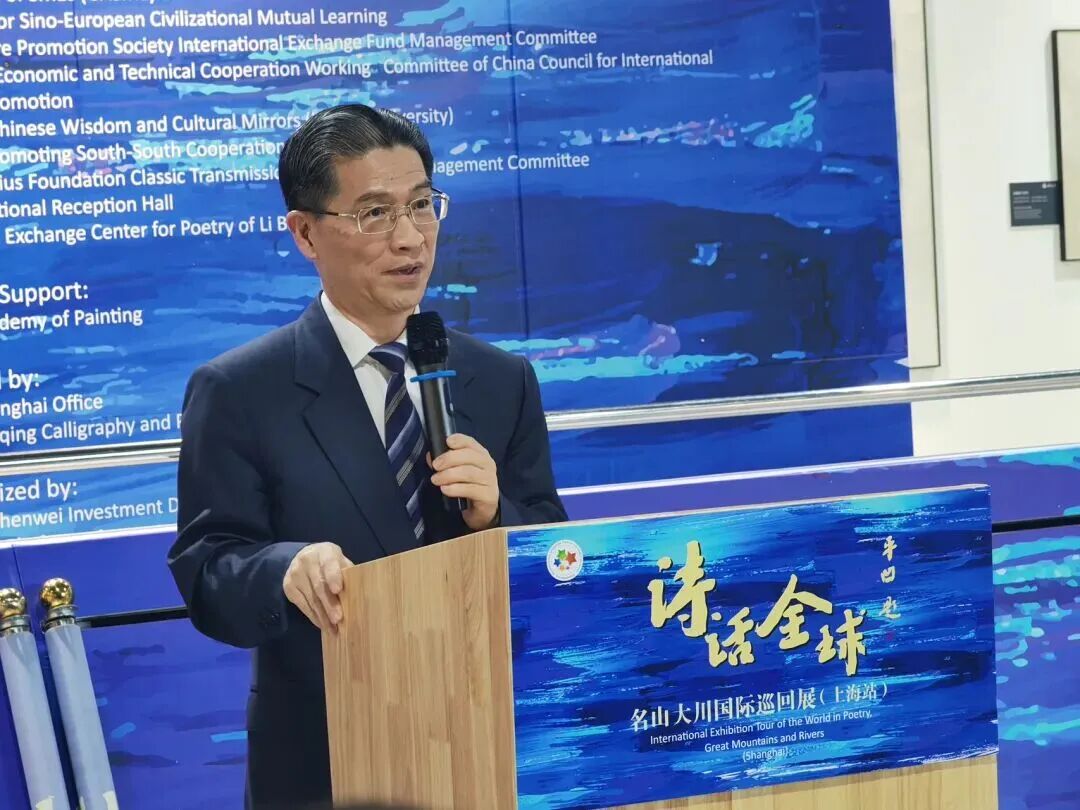 周汉民会长在致辞中说,文化是一个国家、一座城市的灵魂。中国名山大川的诗话蕴含着丰富的文化内涵和哲学思考,是中国传统文化的重要组成部分。本次巡展作品凭借其独特的自然风貌、深厚的人文底蕴和先进的生态智慧,为全球提供了人与自然和谐共存的东方范式,其世界意义不仅体现在景观的壮丽上,更在于为人类贡献了可持续发展的哲学理念与不朽诗篇。今天我们这一场跨越语言与国界的艺术对话,充分体现了海纳百川、追求卓越的上海城市精神。