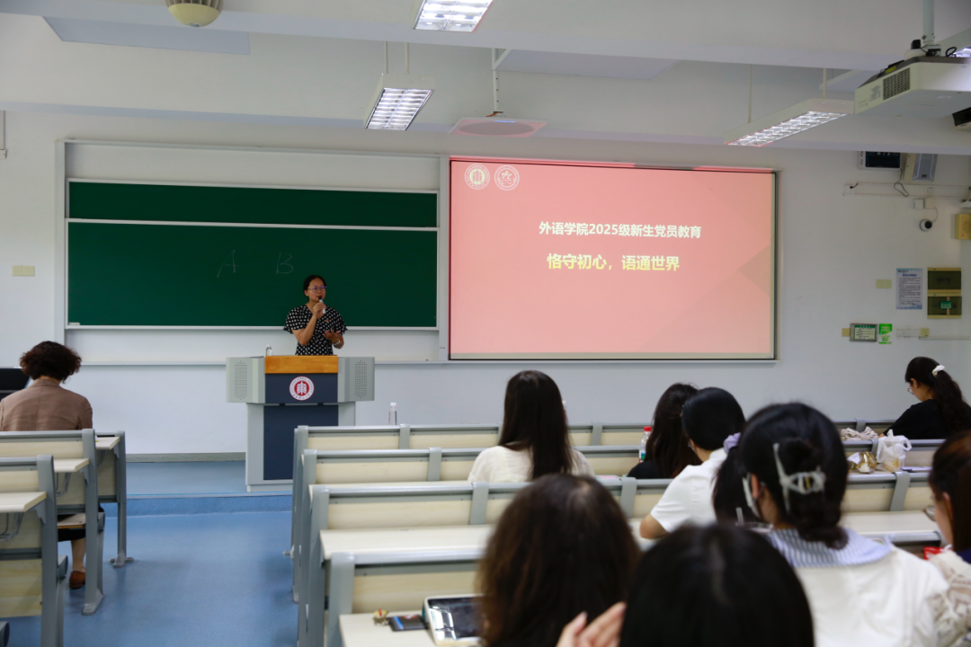 4166am金沙信心之选党委副书记兼副院长武娟以“恪守初心,语通世界”为主题讲专题党课。她结合外语学科特色,寄语新生党员要坚定理想信念,秉持服务精神,既扎根学科专业、提升语言能力,又胸怀家国情怀、勇担责任使命,把个人发展融入民族复兴和人类命运共同体的伟大实践,努力让自己成长为卓越的外语“π”型人才。